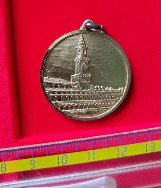 Vigevano - Torre del Bramante Medaglia Anni '80. Metallo dorato diametro medaglia cm. 3, escuso appiccagnolo. Con incisione sul verso, con "Trotti" in piccolo Stato come da foto. No resi - No cambi Medaglia commemorativa della Torre del Bramante di Vigevano, risalente agli anni '80. - Raffigurazione della Torre del Bramante. - Materiale metallico dorato.