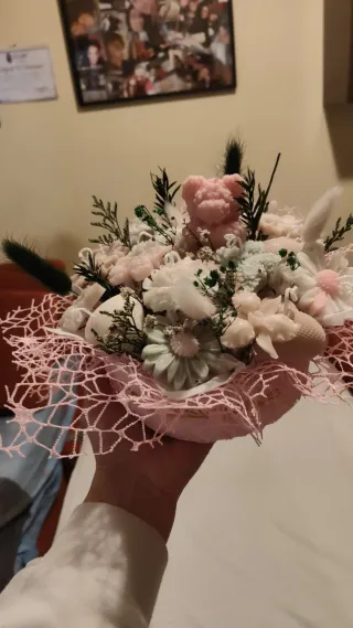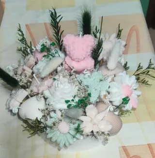 Delicato bouquet di candele in cera di soia, perfetto per decorare o come idea regalo. - Composizione floreale con candele a forma di fiori e orsetto. - Dettagli in verde e piume. - Base decorativa in pizzo rosa.