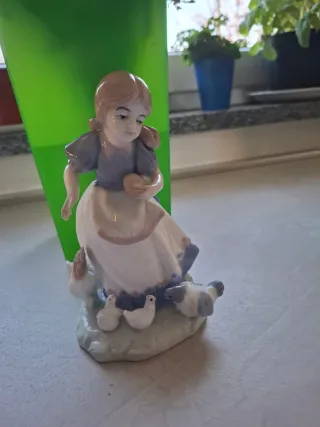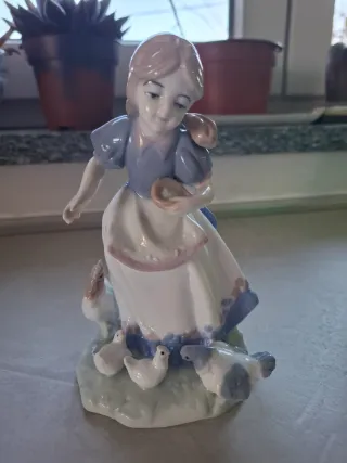 statuetta in porcellana di una ragazza che nutre polli o anatre, probabilmente un pezzo Lladró. Perfetta
