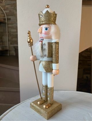 Elegante statua di Schiaccianoci con finiture dorate scintillanti. 30 cm circa - Corona dorata con glitter e dettagli. - Uniforme bianca e oro con glitter. - Barba bianca e scettro dorato. - Base quadrata dorata con glitter.