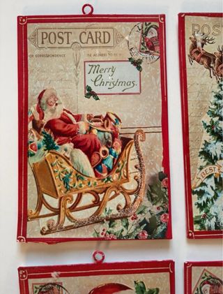 Set di 4 decorazioni natalizie a tema postcard con Babbo Natale, renne e alberi innevati. - Design vintage ispirato alle cartoline. - Motivi natalizi classici. - Ideali per decorare l'albero o la casa durante le feste.
