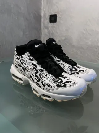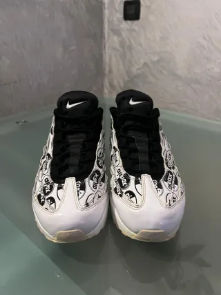 Scarpe Nike Air Max 95 in versione Premium. Design unico con stampa. - Tomaia in pelle e mesh. - Intersuola con ammortizzazione Air. - Suola in gomma. Vendo Nike Air Max 95 in versione Premium, colorazione classica bianco e nero. Praticamente nuove. Usate pochissimo, con unita Air limpide e intatte. Interni originali. Condizioni: Come visibile dalle foto, la suola presenta un leggero e naturale ingiallimento dovuto al tempo (ossidazione dei materiali), e non per utilizzo. Accessori: Include la sua scatola originale, leggermente usurata. Prezzo: 95 trattabili