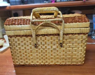 Elegante cesto in vimini, perfetto per conservare oggetti o come elemento decorativo - Realizzato in vimini e legno. - Colori naturali beige e marrone. - Dotato di un pratico manico per il trasporto.