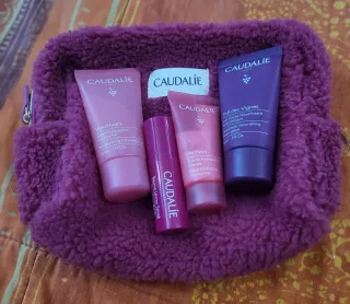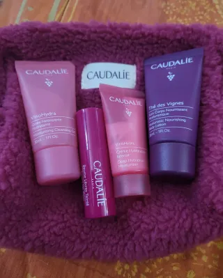 Set di prodotti per la cura della pelle Caudalie. - Include una crema idratante, un gel detergente, una lozione corpo e un balsamo labbra. - La confezione è di colore rosa e viola. Include una pochette Nuovo mai usate