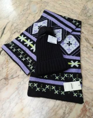 Set coordinato composto da cappello e sciarpa con un originale motivo a fantasia. - Fantasia geometrica con rombi e croci. - Dettagli a contrasto in viola e giallo. - Pompon sulla sommità del cappello. - Ideale come idea regalo.