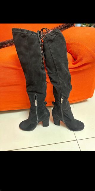 Eleganti stivali alti in camoscio, perfetti per completare ogni outfit. - Materiale: camoscio - Colore: nero - Dettaglio: con i lacci dietro con occhielli dorati - Lunghezza: sopra il ginocchio