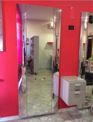 Arredamento per salone di parrucchiere. 3 specchi a tutta altezza 3 poltrone nero con pompa 3 poggia piedi 3 mobiletti porta phon e oggetti 2 lavatesta nero mobile cassa e retro cassa 2 poltrone attesa rosse 1 divanetto due posti rosse