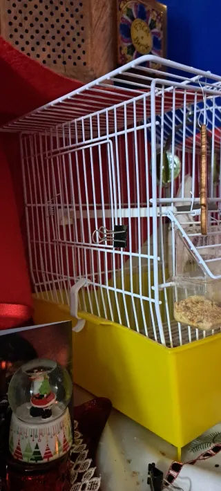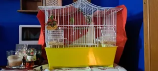 Vendo gabbietta per piccoli volatili completa di tutto il necessario per iniziare subito. La gabbia è di colore bianco con base gialla. - Mangiatoie incluse. - Posatoi interni. - Altalena - beverino - 5 kg di sabbietta - 2 scartole da gr 400 di cibo cocorite - ossi di seppia Circa 40x30