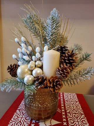 Elegante centrotavola a tema natalizio, perfetto per aggiungere un tocco festivo alla tua casa. - Realizzato in metallo e legno. - Design decorato con dettagli in rilievo. - Colore oro e marrone.
