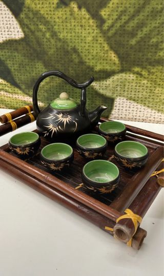🍶servizio da sake con 6 tazzine, teiera e vassoio 💚🤎colore verde e marrone scuro quasi nero 📦 nuove mai utilizzate, purtroppo non c’è la confezione originale 🎁 perfette come regalo per natale!