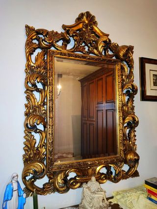 SPECCHIO CON CORNICE COLORE ORO Dimensioni: 50x70cm, dimensione cornice: 90cm x 115cm circa 📦 ritiro a mano disponibile in zona o consegna personalmente da concordare. Non esitare a chiedere ulteriori informazioni o foto aggiuntive!