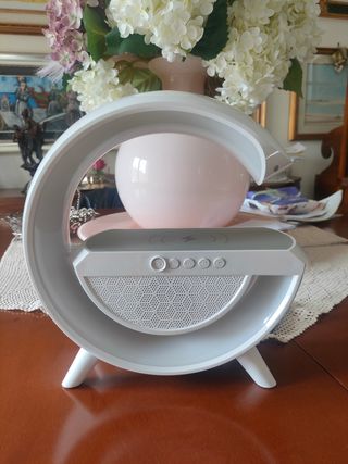 Lampada Ricarica Wireless Bluetooth 5.0 Radio FM, aux, usb, tf card Ricarica wirless smartphone Altoparlante 7 selezioni di luci a led Dimensioni: 22x22x7 cm. Nuova. Scatola un po' ammaccata