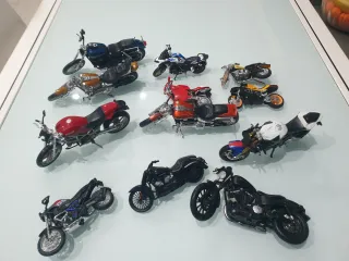 Set di 12 modellini di moto, tra cui modelli Harley Davidson e altri PER RICAMBI - Vari modelli e colori. - Dettagli curati.