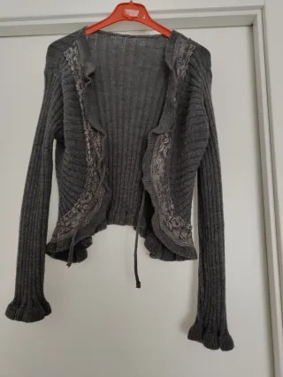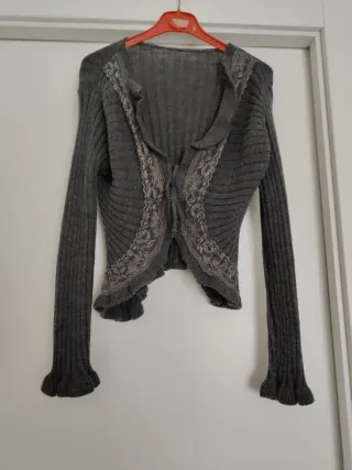 Vendo cardigan bolero a maniche lunghe da donna o ragazza grigio con dettagli in pizzo, vintage, elasticizzato, indossato solo qualche volta, taglia unica, misure in foto, stile gotico romantico boho, chiusura con laccetti centrali sul davanti, made in Italy, etichetta con composizione in foto.