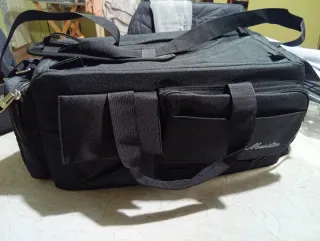 Borsa per attrezzatura fotografica in tessuto nero. - Tasche esterne frontali. - Manici superiori e tracolla. - Logo Moestar ricamato sul lato.