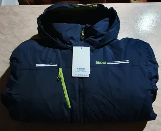 Giubbotto da montagna da uomo, taglia XXL. Colore blu scuro con dettagli lime. - Cappuccio integrato. - Zip frontale. - Tasca sulla manica con zip lime per ski pass più altre tasche con zip lime e scritta Brugi. - Logo Brùgi sul petto.