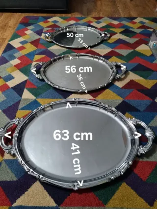 Elegante set di tre vassoi ovali con manici decorati. Perfetti per servire o come elementi decorativi. - Vassoio grande: 63 cm x 41 cm - Vassoio medio: 56 cm x 36 cm - Vassoio piccolo: 50 cm x 33 cm