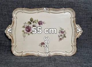 Elegante vassoio di grandi dimensioni, perfetto per servire o come pezzo decorativo. - Finitura in legno con dettagli anticati. - Decorazioni floreali con rose e margherite. - Bordi sagomati e manici laterali.