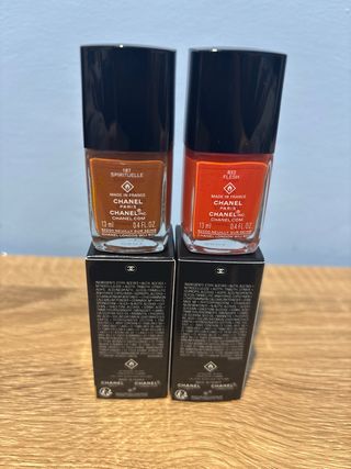 Due smalti per unghie Chanel Le Vernis. - Smalto n. 187 Spirituelle (marrone). - Smalto n. 832 Flesh (arancione). - Capacità: 13 ml ciascuno.