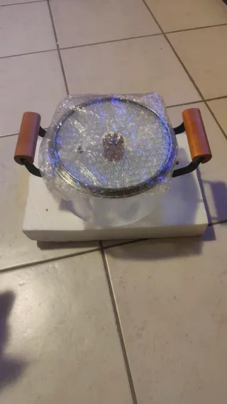 Pentola in vetro da 3,5 litri con coperchio e manici in legno. - Materiale principale: vetro. - Dettagli dei manici: legno. - Colore del vetro: trasparente. - Colore dei manici: marrone.