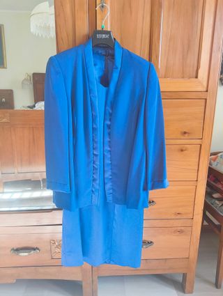 Elegante Completo sartoriale da donna blu in pura lana, composto da abito intero e giacca. Misure giacca: lunghezza: cm 70, circonferenza seno: cm 114, larghezza spalle: cm 40, lunghezza manica: cm 53. Misure abito: lunghezza: cm 102, circonferenza seno: 100 cm, circonferenza vira: 106 cm, larghezza spalle: 40 cm, lunghezza maniche: 44 cm. Vendita da privato con clausola "visto e piaciuto"