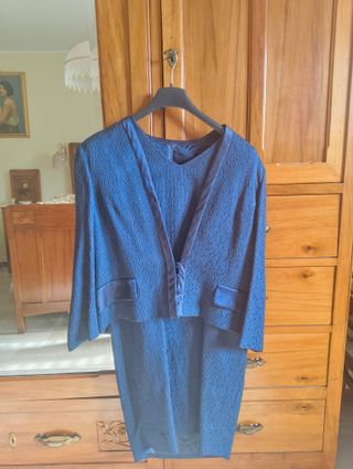 Elegante completo sartoriale da donna blu scuro in pura lana, con texture e composto da giacca con dettagli in raso, risvolto sulle tasche e chiusura a bottoni, e abito a manica corta con finiture in raso e chiusura a zip. Misure giacca: lunghezza: cm 58, circonferenza seno: cm 104, larghezza spalle: 43 cm, lunghezza maniche: 54 cm. Misure abito: lunghezza: cm 98, circonferenza seno: 96 cm, circonferenza vita: 98 cm, larghezza spalle: 40 cm, lunghezza maniche: cm 34. Vendita da privato con clausola "visto e piaciuto"