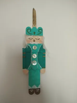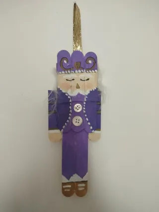 Decorazione a forma di schiaccianoci, realizzata a mano. - Realizzato con bastoncini di legno. - Dettagli dipinti a mano con colori vivaci. - Corona decorata e dettagli dorati. - Capelli bianchi e barba. - Bottoni decorativi sul petto.