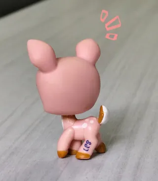 Piccolo cerbiatto rosa della collezione Littlest Pet Shop, numero 1414. - Design con grandi occhi azzurri e macchie bianche. - Coda marrone con macchie bianche. - Orecchie rosa con interno chiaro.