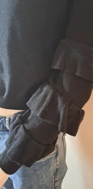 Maglioncino primaverile Susy Mix tg. S (sull'etichetta è indicata come T.U.) con maniche a balze. - Maniche lunghe a sbuffo con balze. - Scollo a barca.