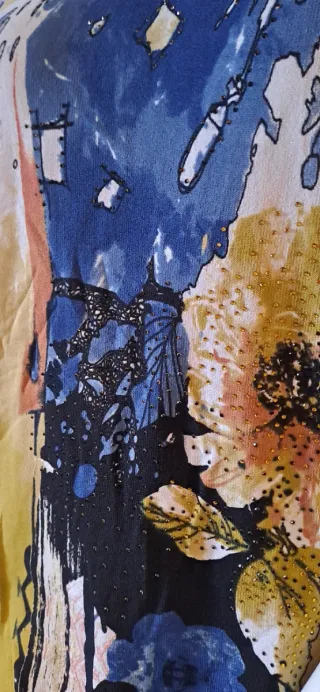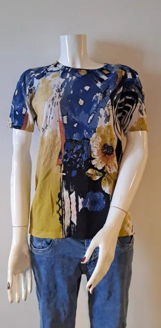 Maglia a maniche corte Carla Ferroni tg. L con una stampa astratta e colorata. - Girocollo. - Stampa multicolore con tocchi di blu, giallo e nero.