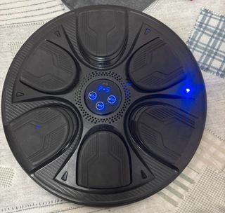 Macchina da boxe smart con design circolare. - Display centrale con indicazioni. - Pulsanti per volume e selezione. - Luci LED blu.
