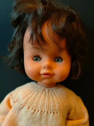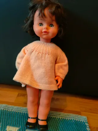 Bambola vintage con un grazioso vestito lavorato a maglia. - Vestito rosa in maglia. - Scarpe nere. - Capelli castani.
