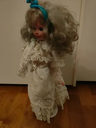 Deliziosa bambola vintage con un abito elegante. - Vestito bianco in pizzo con dettagli di perline. - Capelli lunghi e ondulati. - Accessori decorativi sul collo.