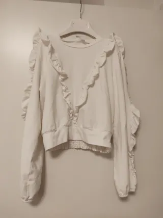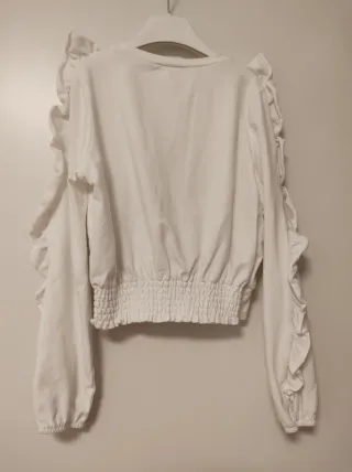 Maglia bianca per bambina, taglia 152 cm. Presenta dettagli con rouches sulle maniche e lungo la scollatura. - Maniche lunghe. - Fondo elasticizzato.