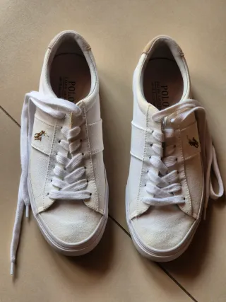 Scarpe da ginnastica Polo Ralph Lauren in tela bianca. Indossate una o due volte. - Logo del cavallo ricamato sul lato. - Dettaglio in pelle sul tallone. - Chiusura con lacci.
