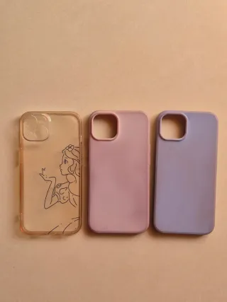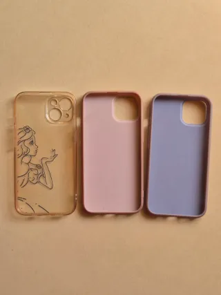 Set di tre cover per iPhone 14. - Cover trasparente con disegno. - Cover color lilla. - Cover color lavanda.