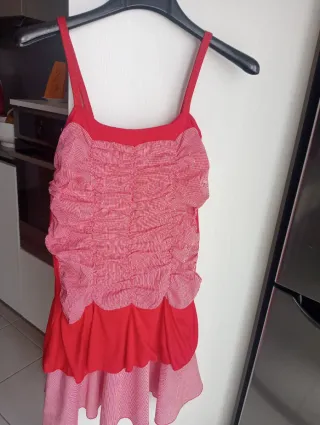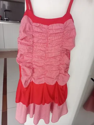 Mini abito rosso con dettagli a righe bianche e rosse, realizzato su misura. - Scollo a cuore. - Spalline sottili. - Corpino con arricciature. - Gonna a balze. Utilizzabile anche come costume di Carnevale, Belle Epoque - Charleston
