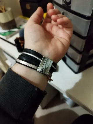 Elegante bracciale con chiusura magnetica e un ciondolo a forma di fiore della vita. - Design multistrato con finiture in similpelle. - Dettaglio centrale in metallo argentato.