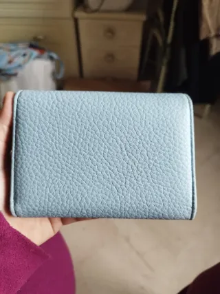Elegante portafoglio da donna con un grazioso dettaglio a forma di cuore. - Materiale effetto martellato. - Chiusura a bottone. - Design compatto e pratico. Portafoglio come nuovo azzurro con cuore con porta tessere, portamonete e uno spazio per le banconote Lunghezza: 14cm Larghezza: 11cm