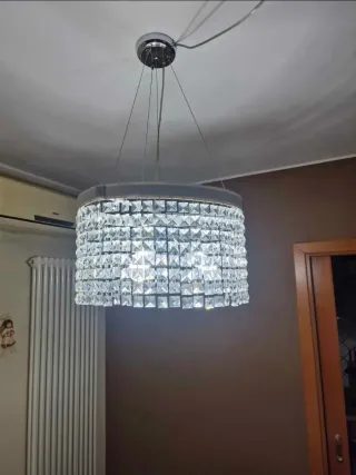 Elegante lampadario con cristalli Swarovski e due applique abbinate. Un set che aggiunge un tocco di lusso a qualsiasi ambiente. - Lampadario con decorazioni in cristallo. - Due applique coordinate. - Dettagli in metallo argentato.