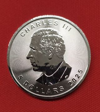 Moneta da 1 oncia d'argento puro del Canada "Foglia di Acero", coniata nel 2025, con l'effige del Re CARLO III. - Peso: 1 oz (oncia troy) - Purezza: 9999 Argento Puro - Valore nominale: 5 Dollari Canadesi - Conservazione: FdC - Anno: 2025 Come da foto Fornita in capsula protettiva.