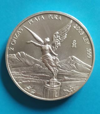 Bellissima moneta da investimento 2 Once Plata Pura del MEXICO "Libertà" anno 2009. - Peso: 1 oncia ( 62,21 gr.) - Diametro: 48 mm. - Spessore: 3,5 mm. - Purezza: Plata Pura (0,999) - Condizioni: FDC (Fior di Conio)