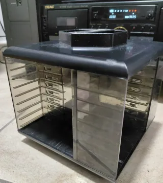 Pratico porta musicassette girevole in stile vintage. - Capacità 20/32 musicassette. - Design a girandola.