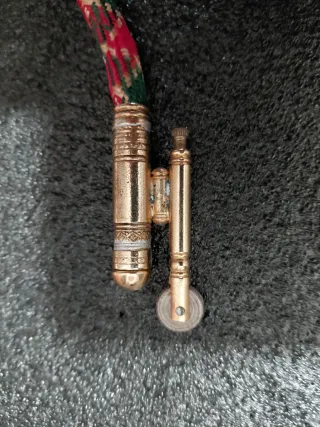 Un accendino vintage con un design unico che ricorda una torcia. - Corpo in metallo dorato con incisioni. - Corda intrecciata colorata (rosso, verde, oro) che funge da stoppino. - Dettagli in metallo lucido.