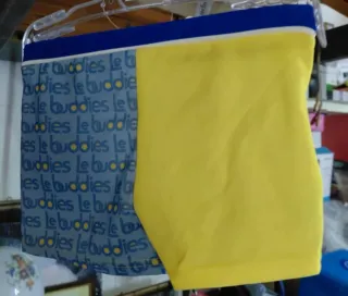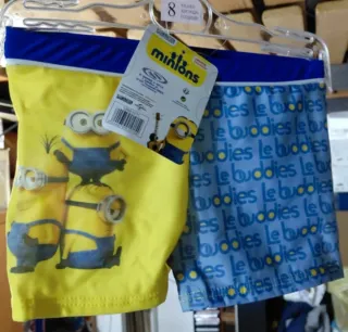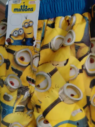 Costume da bagno per bambino con i Minions, ideale per la spiaggia o la piscina. Design vivace e divertente. - Stampa dei Minions su sfondo blu. - Tessuto leggero e ad asciugatura rapida. - Elastico in vita con laccetti per una vestibilità comoda.