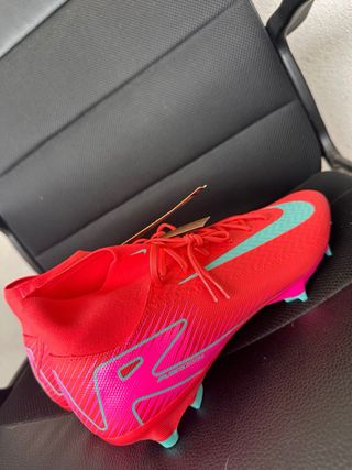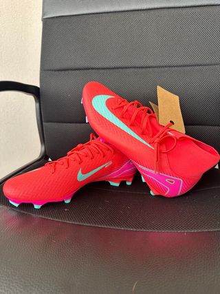 Scarpe da calcio Nike Mercurial Superfly 10 Academy. - Design accattivante con dettagli rosa e turchesi. - Tomaia in tessuto rosso. - Suola con tacchetti per campi in erba.