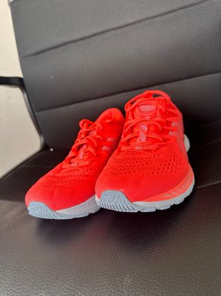 Scarpe da corsa ASICS in un vivace colore rosso con dettagli grigi. - Tomaia in mesh traspirante. - Intersuola ammortizzata per comfort. - Design sportivo e moderno.