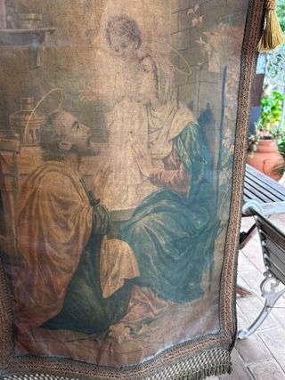 Antigua cromolitografía sobre tela de la Sagrada Familia. Una pieza con encanto para coleccionistas. - Representación de la Sagrada Familia. - Técnica de cromolitografía. - Montada sobre tela.