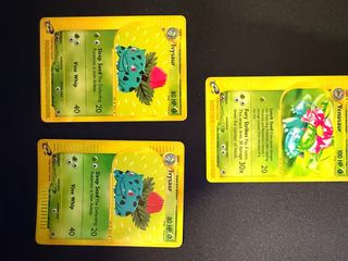 Lotto di carte Pokémon. - 2x Ivysaur (Stage 1 Pokémon, 80 HP) - 1x Venusaur (Stage 2 Pokémon, 100 HP) - Carte con attacchi come Vine Whip, Sleep Seed, Fury Strikes e Leech Seed.