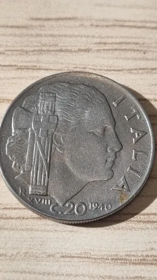 Moneta da 20 centesimi di Lire Italiane, coniata nel 1940. - Dritto: Ritratto di donna con fascio littorio. - Rovescio: Valore 20 CENTESIMI e anno 1940. - Legenda: REGNO D'ITALIA e 20 CENTESIMI.